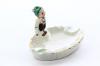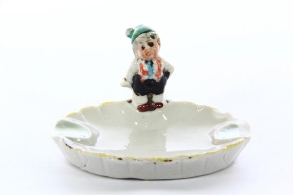 Пепельница с фигуркой гномика. Фарфор, роспись. Западная Европа. Винтаж: 1950-е годы. Сохранность удовлетворительная. Сколы по краям. Длина 7,5 см, ширина 5 см, высота 4 см.