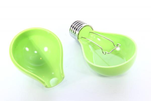 Пепельница для сигарет. Выполнена в виде лампочки зеленого цвета. Пепельница легко открывается и закрывается, внутри пепельницы есть одна подставка для сигареты. Материал: пластик, металл. Размеры: 13,5 см х 8 см х 7 см. Вес: 165 г. Сделано в Китае