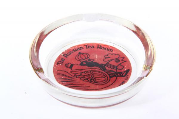 Стеклянная пепельница. Винтаж, вторая половина ХХ века. Имеется хорошо читаемая надпись: The Russian Tea Room New York City 150 West 57th St. N.Y. N.Y. Диаметр 10 см, высота 2 см. Куплена в США