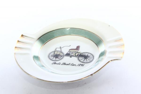 Сувенирная фарфоровая пепельница Fords First Car 1896. Винтаж: 1970-е годы. Длина 15 см, ширина 14 см, высота 2 см. Сделано в Японии