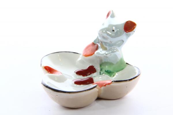 Фарфоровая пепельница с фигуркой мышонка. Длина 8 см, ширина 8 см, высота 6 см. Сделано в Японии в 1950-х годах